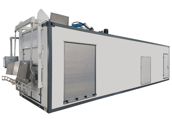1. The infectious material is temporarily held in a waste container(s) which in turn, are emptied into an pre storage hopper via a feeding system which is located at the front of the MDU.